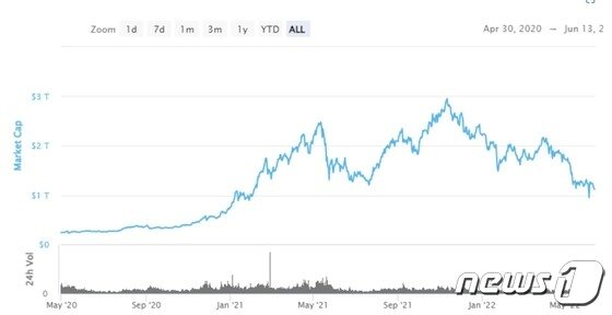 암호화폐 시총 추이(단위 조달러) - 코인마켓캡 갈무리 |