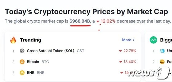 13일 오후 8시 40분 현재 암호화폐 시총은 24시간 전보다 12.02% 급락한 9688억4000만 달러를 기록하고 있다.