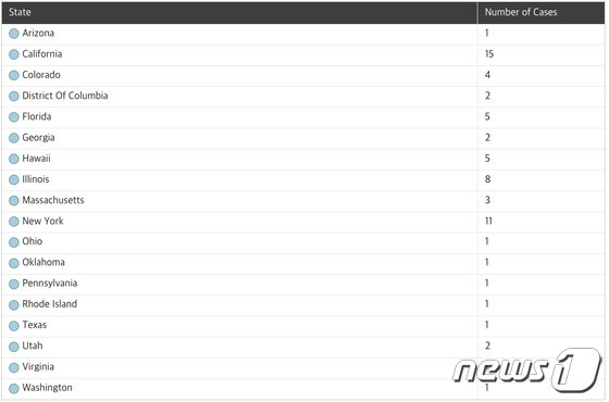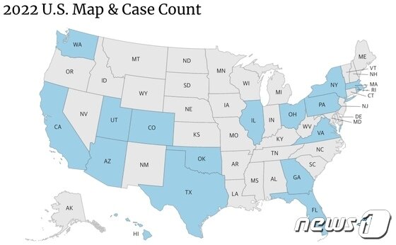 미국 내 원숭이두창 환자가 가장 많이 발생한 곳은 캘리포니아(15명)-뉴욕(11명)-일리노이(8명) 순이다. 출처=미 질병통제예방센터(CDC) © 뉴스1 |