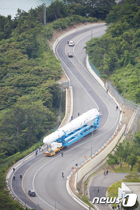 한국형 발사체 누리호(KSLV-Ⅱ)가 15일 전남 고흥군 나로우주센터 내 발사대로 이송되고 있다. (항공우주연구원 제공) 2022.6.15/뉴스1 |