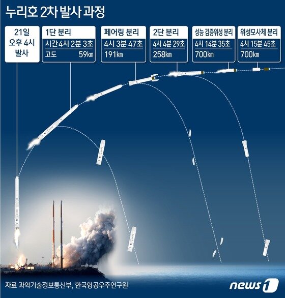 이날 오후 4시에 발사한 누리호는 16분간 성공적인 비행을 마쳤다. 한국항공우주연구원(항우연)의 원격 수신 정보 초기 분석 결과에 따르면 누리호는 발사후 정해진 시퀀스에 따라 123초경 고도 약 62km에서 1단 분리, 227초 고도 202km에서 페어링 분리, 269초에 고도 273km에서 2단분리, 875초 고도 700km에서 성능검증 위성 분리했으며, 945초에는 위성 모사체 분리까지 성공함으로써 비행 전 과정을 정상적으로 완료했다.