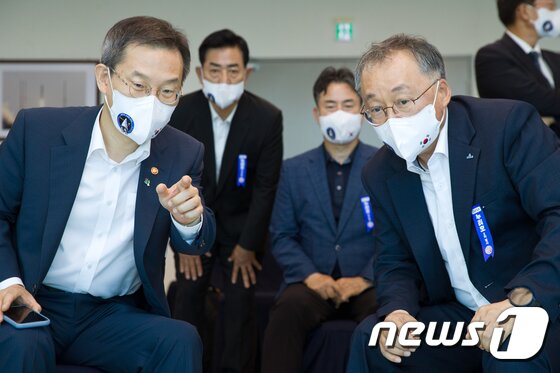 이종호 과학기술정보통신부 장관이 21일 오후 전라남도 고흥군 나로우주센터에서 이상률 한국항공우주연구원장 등과 누리호 발사를 참관 하고 있다.(과학기술정보통신부 제공) 2022.6.21/뉴스1 © News1 신웅수 기자 |