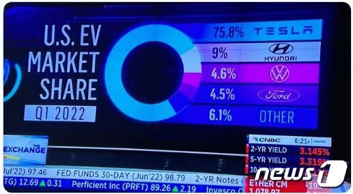 지난 1분기 미국 전기차 시장 점유율은 테슬라가 압도적 1위다. 테슬라는 전체 시장의 75.8%를 차지하고 있다. 그 뒤를 현대(9%), 폴크스바겐(4.6%), 포드(4.5%)가 잇고 있다.