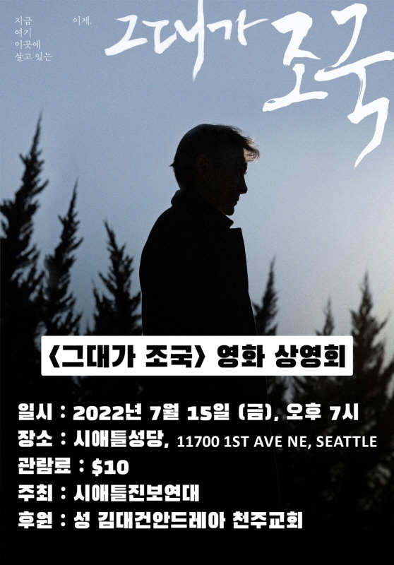 시애틀 진보연대(대표 황규호)는 오는 15일 오후 7시 시애틀 성당(성 김대건안드레아 천주교회)에서 <그대가 조국>을 상영한다고 밝혔다. 이번 시애틀 상영은 배급사인 엣나인필름과 협조해 공동체상영 형식으로 이뤄지게 됐다.