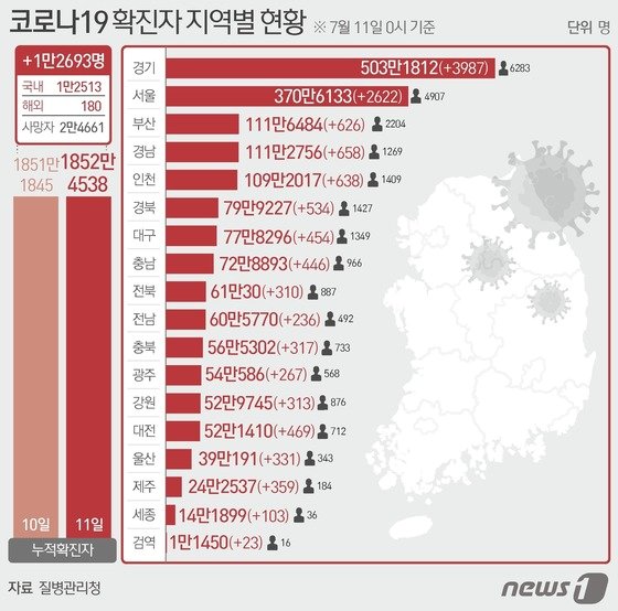 최근 일주일 확진자는 3430명(4일 433명→5일 451명→6일 488명→7일 561명→8일 504명→9일 524명→10일 469명)으로 하루 평균 490명 꼴이다. 직전 일주일 하루 평균 확진자는 237명으로 두배 가까이 늘었다.