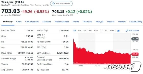 11일(현지시간) 뉴욕증시에서 테슬라의 주가는 전거일보다 6.55% 급락한 703.03달러를 기록했다.