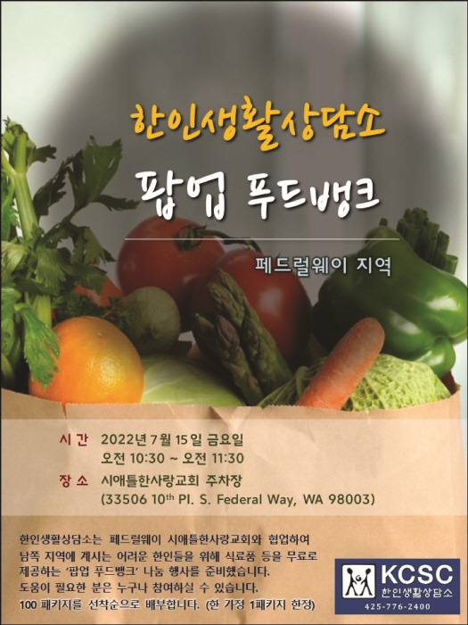 한인생활상담소(소장 김주미)는 15일 오전 10시30분부터 1시간동안 페더럴웨이에 소재한 시애틀 한사랑교회 주차장에서 한인 대상 팝업 푸드뱅크를 운영한다.