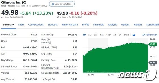 이에 따라 이날 시티의 주가는 전거래일보다 13.23% 폭등한 49.98달러를 기록했다.