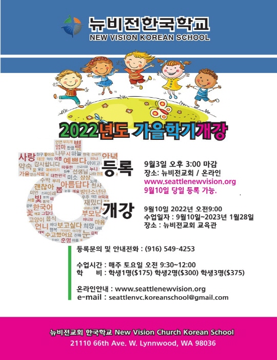 시애틀 뉴비전교회(담임 천우석 목사) 한국학교가 2022년도 가을 학기를 개강하기로 하고 학생들을 모집한다.