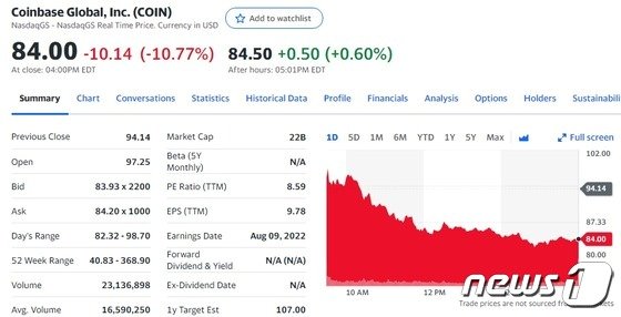 11일(현지시간) 뉴욕증시에서 코인베이스는 전거래일보다 10.77% 폭락한 84.00달러를 기록했다.