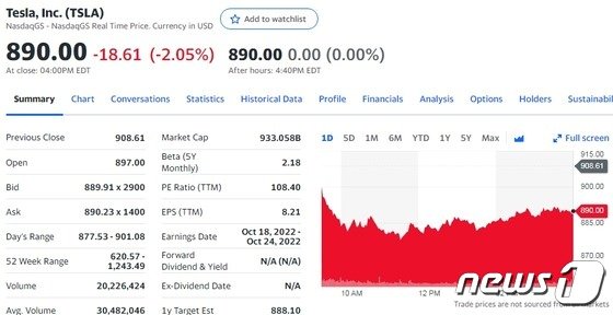 19일(현지시간) 뉴욕증시에서 테슬라의 주가는 전거래일보다 2.05% 하락한 890.00달러를 기록했다. 테슬라가 800달러 대로 주저앉은 것은 지난 12일 이후 처음이다.
