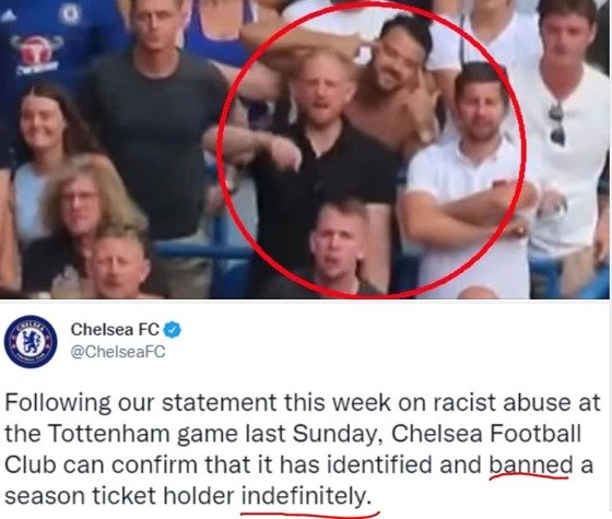 첼시는 20일 "지난 15일 토트넘전에서 인종차별 행위를 한 시즌 티켓 소지자의 신원을 확인했다"며 "당사자를 첼시 홈구장에 무기한 출입 금지했다"고 알렸다. 사실상 영구출입을 금한 것이다.