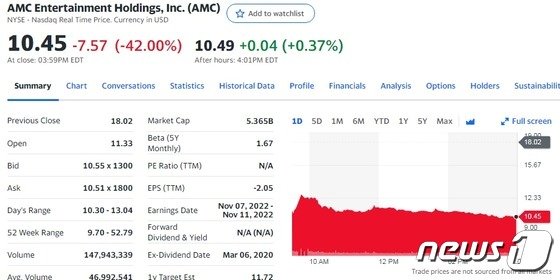 22일(현지시간) 미국증시에서 AMC의 주가는 전거래일보다 42% 폭락한 10.45달러를 기록했다.