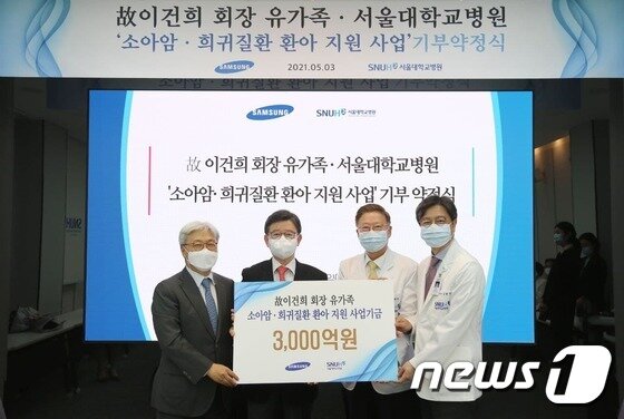 최근 1조원대 의료 기부를 발표한 고(故) 이건희 삼성전자 회장 측과 서울대병원이 기부 약정식을 갖고 '소아암·희귀질환 환아 지원사업'을 본격 추진하기로 했다. 서울대어린이병원에서 열린 기부약정식에서 이인용 삼성전자 CR담당 사장(왼쪽부터), 성인희 삼성 사회공헌업무총괄 사장, 김연수 서울대병원장, 김한석 서울대어린이병원장이 기념촬영하고 있다. (삼성전자 제공) 2021.5.3/뉴스1 |