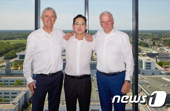이재용 삼성전자 부회장이 네덜란드 에인트호번에 위치한 ASML 본사에서 피터 베닝크 CEO(왼쪽), 마틴 반 덴 브링크 CTO와 기념 촬영하고 있다. (삼성전자 제공) 2022.6.15/뉴스1 |