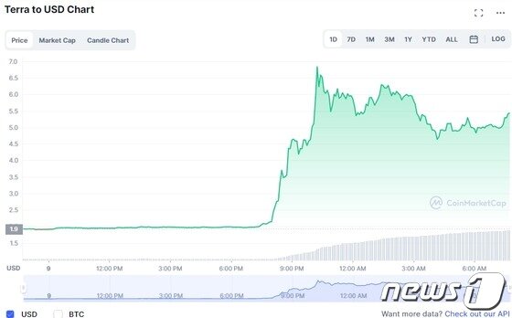 코인데스크에 따르면 루나 클래식은 이날 2달러 미만에서 거의 7달러까지 치솟았다. 이는 6월 초에 기록했던 사상최고치에 근접한 것이다.