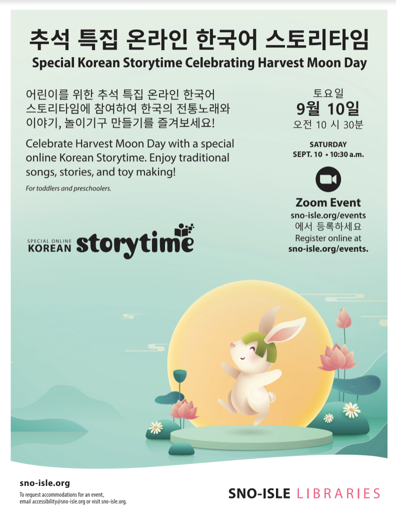스노아일 도서관에서 추석을 맞아 10일 토요일 오전 10시 30분부터 11시 15분까지 온라인 줌으로 추석특집 한국어 스토리 타임 시간을 갖는다.