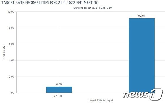 연방기금금리(미국의 기준금리) 선물은 12일(현지시간) 시카고상품거래소(CME)에서 연준이 9월 FOMC에서 0.75%포인트의 금리인상을 할 확률을 92%까지 반영하고 있다. 이는 전일의 91%에서 1%포인트 상승한 것이다.