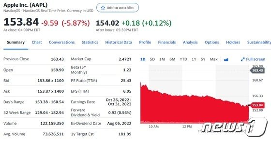 13일(현지시간) 뉴욕증시에서 애플은 전거래일보다 5.87% 폭락한 153.84달러를 기록했다. 이로써 시총도 2조5000억 달러를 하회했다. 애플의 시총은 한때 3조 달러에 육박했었다.