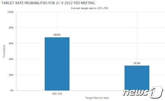 ◇ CME서 1%포인트 금리인상 확률 32% : CPI 발표 직후 시카고상품거래소(CME)에서 거래되는 연방기금금리(미국의 기준금리) 선물은 연준이 9월 FOMC에서 1%포인트의 금리인상을 할 확률을 32%로 반영하고 있다. 0.75%포인트의 금리인상 확률은 68%다.