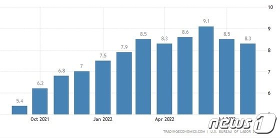 한편 이날 발표된 8월 소비자물가지수(CPI)는 8.3%로 전월의 8.5%보다는 하락했지만 시장의 예상치(8.1%)를 상회했으며, 여전히 40년래 최고 수준이다.