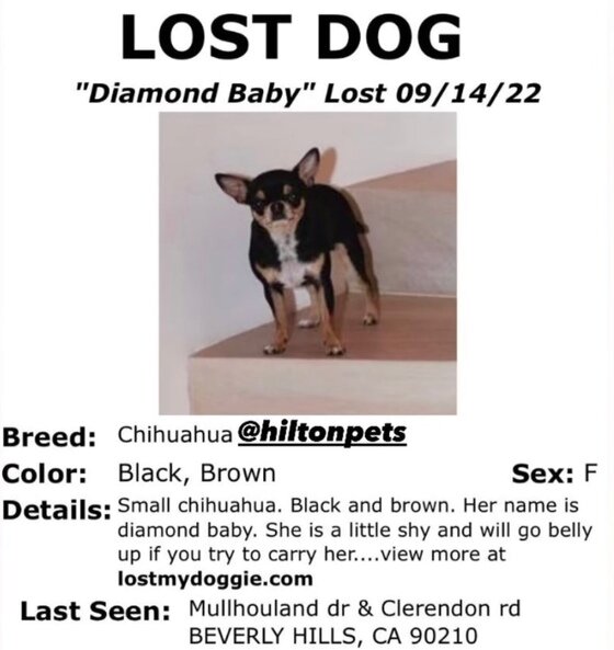그는 "말할 수 없을 정도로 힘들다"며 "지난 수요일 내 강아지 '다이아몬드 베이비'를 잃어버렸다"고 운을 뗐다. 힐튼은 당시 촬영 중이었고 그의 집은 이사가 진행되고 있었다. 힐튼은 강아지가 이삿짐을 옮기는 중 열어둔 문으로 나간 것 같다고 설명했다.