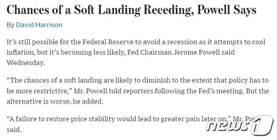 미국의 월스트리트저널(WSJ)은 파월 의장이 "연착륙 가능성이 줄고 있다"고 발언한 부분이 시장을 자극한 것으로 보인다고 분석했다.