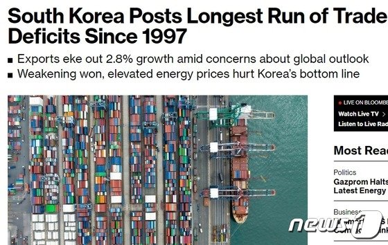 블룸버그 “韓 IMF 이후 최장기 무역적자, 세계 침체 경고등”