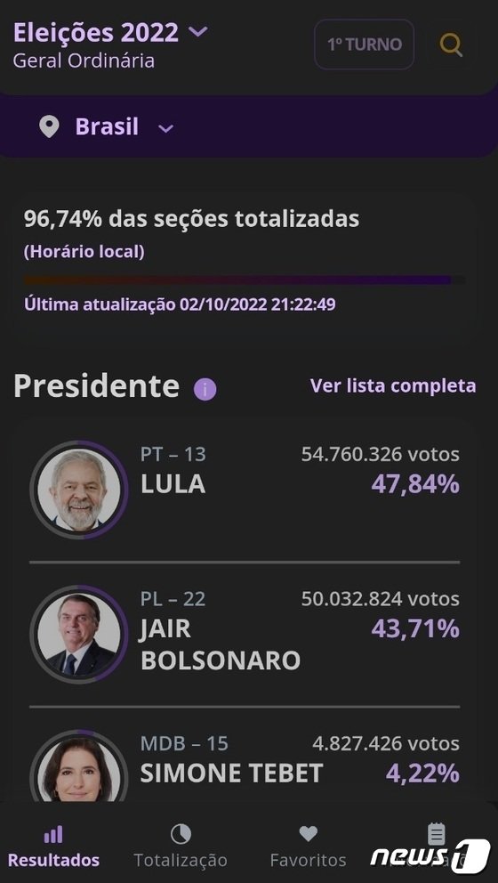 브라질 최고선거법원(TSE)에 따르면 이날 오후 9시22분(한국시각 3일 오전 9시 22분) 개표가 96.42% 진행된 결과 노동자당(PT) 후보로 나선 루이스 이나시우 룰라 다 실바(76) 전 대통령이 47.85%(5488만7668표) 득표해 1위를 달리고 있다.