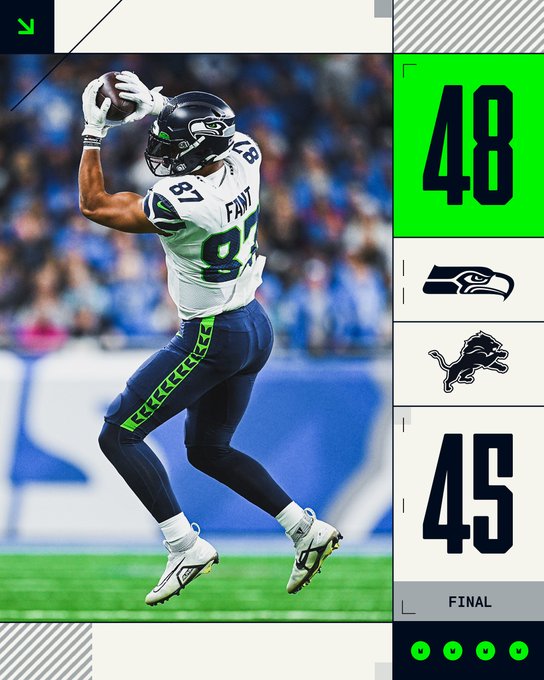 시혹스는 2일 디트로이트에서 열린 라이온스의 원정경기에서 시종 일관 리드하는 게임으로 48-45로 최종 승리를 거뒀다. 이로 인해 시혹스 홈 개막전에서 승리한 뒤 2연패를 한 뒤 3경기 만에 다시 승리를 거뒀고, 시즌 전적 2승2패로 50%의 승률을 확보했다.