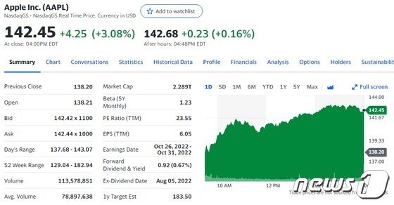 그러나 3일에는 반등에 성공했다. 이날 뉴욕증시에서 애플은 전거래일보다 3.08% 급등한 142.45달러를 기록했다.