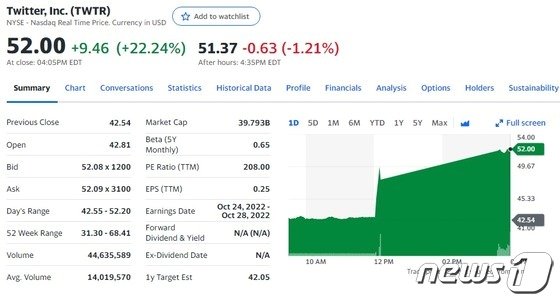 4일(현지시간) 뉴욕증시에서 트위터는 전거래일보다 22.24% 폭등한 52.00달러를 기록했다.