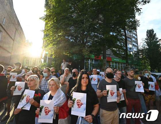 3일(현지시간) 우크라이나 키예프 소재 벨라루스 대사관 앞에서 시위대가 벨라루스 반체제 인사 비탈리 시쇼프(26)의 사진을 든 채 추모 집회를 열고 있다. 비정부기구 ‘벨라루스 하우스’를 이끌었던 시쇼프는 실종된 지 하루 만에 공원에서 숨진 채 발견됐다. © AFP=뉴스1 © News1 서한샘 기자 |