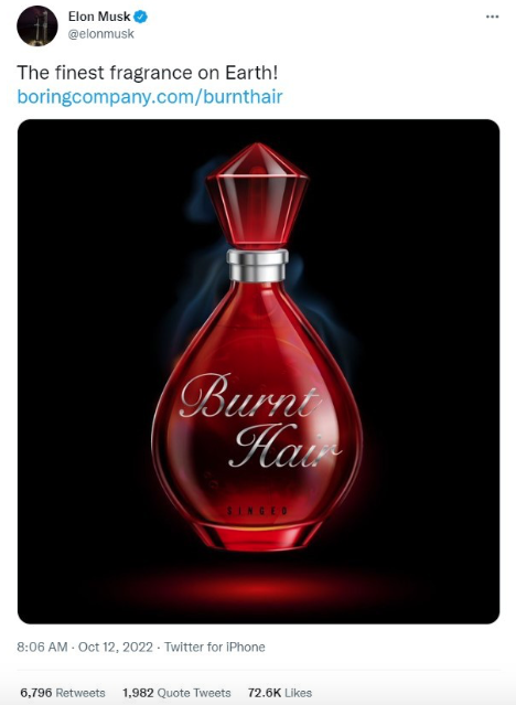 11일(현지시간) 머스크는 자신의 트위터에 자신의 '번트 헤어' 향수를 "지상 최고의 향기!"라고 소개하며 향수를 구매할 수 있는 인터넷 주소를 공개했다.