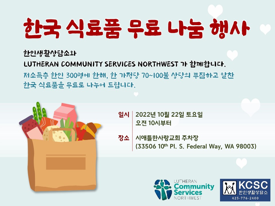 한인생활상담소(소장 김주미)가 루터란 커뮤니티 서비스 노스웨스트와 협력해 시애틀 남쪽지역 어려운 저소득층 한인들을 위해 선착순 300명에 한해 가정당 70~100달러 상당의 푸짐하고 알찬 한국 식료품을 무료로 나누는 행사를 펼친다.