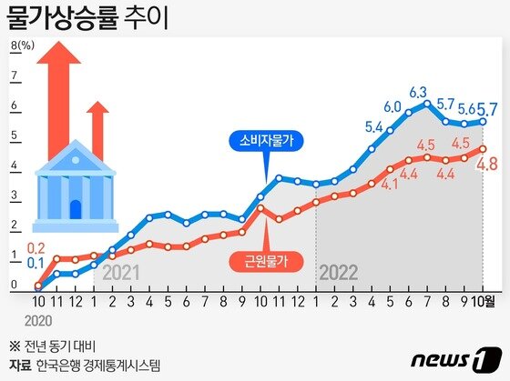 6일 통계청에 따르면 국내 소비자물가는 지난 5월부터 5~6%대의 고물가를 기록 중이다. 전년 동월 대비 소비자물가 상승률을 살펴보면 지난 5월 5.4%로 5% 선을 넘은 뒤, 6월 6.0%에 이어 7월 6.3%까지 올랐다. 이어 8월 5.7%, 9월 5.6%로 하락세를 보이다가 10월에는 5.7%로 반등했다.