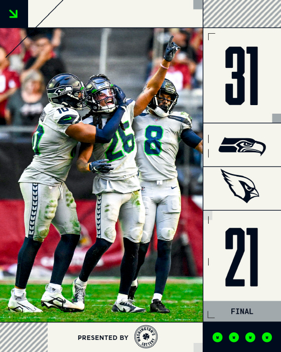 시혹스는 6일 낮 애리조나에서 열린 디비전 라이벌 카디널스와의 시즌 9주차 원정경기에서 대체로 여유있게 앞서가면서 31-21로 승리를 거뒀다.