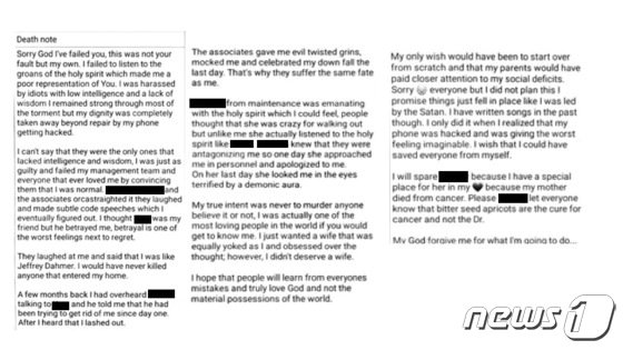 그는 "몇 달 전 나는 한 동료의 대화를 엿들었다. 그는 입사 첫날부터 나와 함께 일하고싶지 않다고 다른 동료에게 말했다. 그 이후부터 나는 폭발했다. 동료들은 마지막까지 나를 조롱했다. 그래서 그들은 나와 같은 운명을 맞이하게 된 것"이라고 적었다.