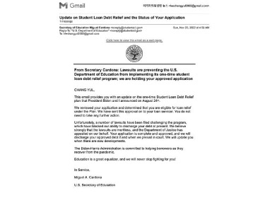 한편 연방 정부는 학자금 탕감 신청에 대한 승인 여부를 개인 이메일로 지난 20일 발송했다.