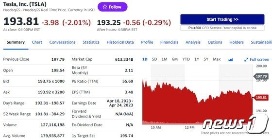 6일(현지시간) 뉴욕증시에서 테슬라의 주가는 전거래일보다 2.01% 급락한 193.81달러를 기록했다.