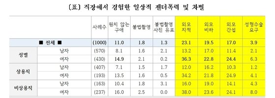 '외모 비하'(여성 22.8%, 남성 17.0%), '외모 간섭'(여성 24.4%, 남성 11.4%)도 여성 직장인이 남성 직장인보다 더 많이 경험했다.