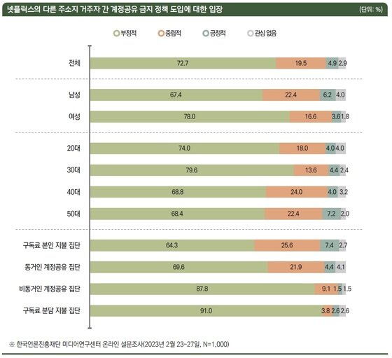 | 한국언론진흥재단 미디어연구센터는 9일 '넷플릭스의 계정공유 제한 강화 정책에 대한 이용자인식' 조사 결과를 발표했다. 넷플릭스의 계정공유 금지 정책에 대한 설문 결과. (한국언론진흥재단 제공) |