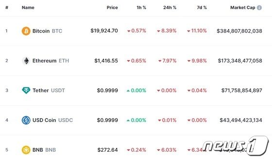 | 이 시각 현재 주요 암호화폐 시황 - 코인마켓캡 갈무리 |