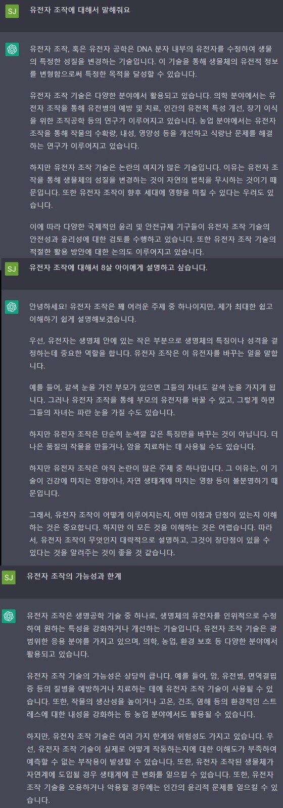 유전자 조작에 대한 챗GPT의 답변. 구체적 상황을 제시하면 답변이 크게 달라진다. (챗GPT 화면 갈무리) 2023.03.10 /뉴스1 |