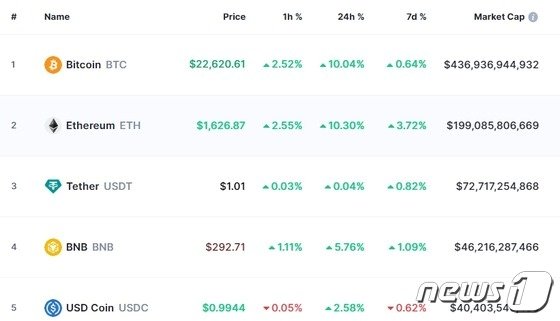 13일 오전 9시 40분 현재(한국시간 기준) 비트코인은 글로벌 코인시황 중계사이트인 코인마켓캡에서 24시간 전보다 10.04% 폭등한 2만2620 달러를 기록하고 있다.