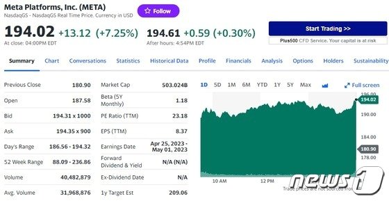 14일(현지시간) 뉴욕증시에서 메타는 전거래일보다 7.25% 급등한 194.02 달러를 기록했다.