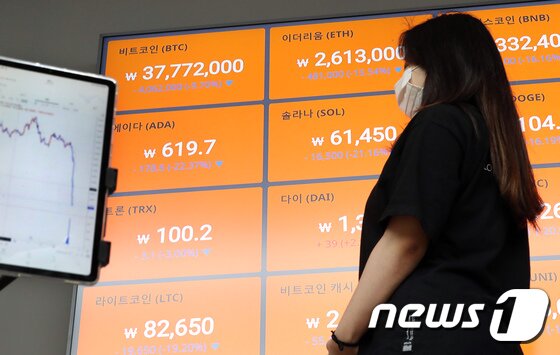 12일 서울 서초구 빗썸 고객센터 전광판에 비트코인 등 각종 가상자산의 가격이 표시되고 있다. 최근 한국 블록체인 기업 테라가 발행하는 스테이블코인 '테라'가 사흘째 무너지면서 자매코인격인 '루나' 역시 5월초 대비 95%에 가까운 폭락이 이어지고 있다. 2022.5.12/뉴스1 © News1 장수영 기자 |