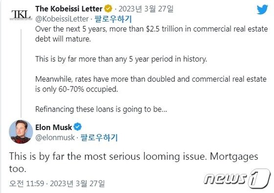 머스크는 “여기에 주거용 모기지가 추가되어야 한다”는 멘션을 붙여 이 글을 리트윗했다. 그는 "이것은 지금까지 가장 심각한 문제"라고 덧붙였다.