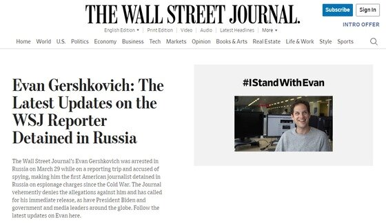 미국 월스트리트저널(WSJ) 페이지에 해시태그 "나는 이반과 연대한다"(#IStandWithEvan) 이미지가 게시 돼 있다. |