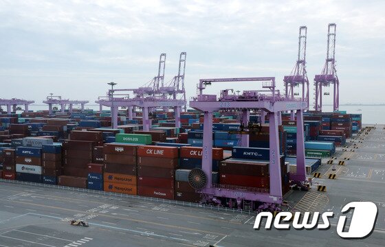 18일 인천 연수구 인천신항에서 컨테이너들이 쌓여 있다. 원달러 환율이 2008년 글로벌 금융위기 이후 1300원을 돌파하며 1400원 돌파까지 가능하다는 전망이 나오고 있다. 국제무역통상연구원은 국제유가와 원-달러 환율이 각각 10% 상승할 경우 수출금액은 0.03%증가에 그치지만 수입단가 상승으로 수입금액은 3.6% 증가한다고 밝혔다. 2022.9.18/뉴스1 © News1 박세연 기자 |